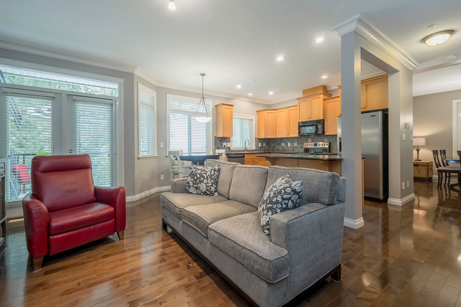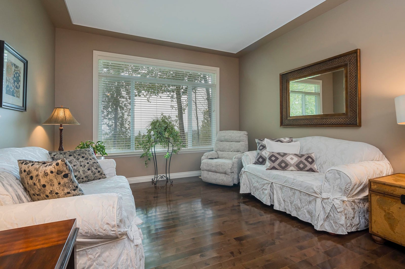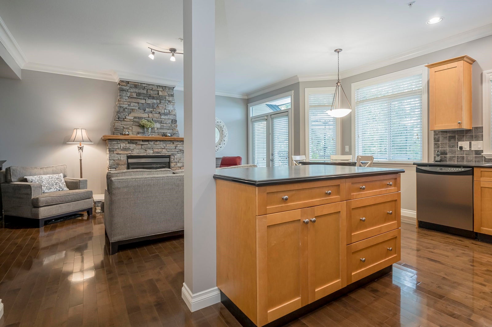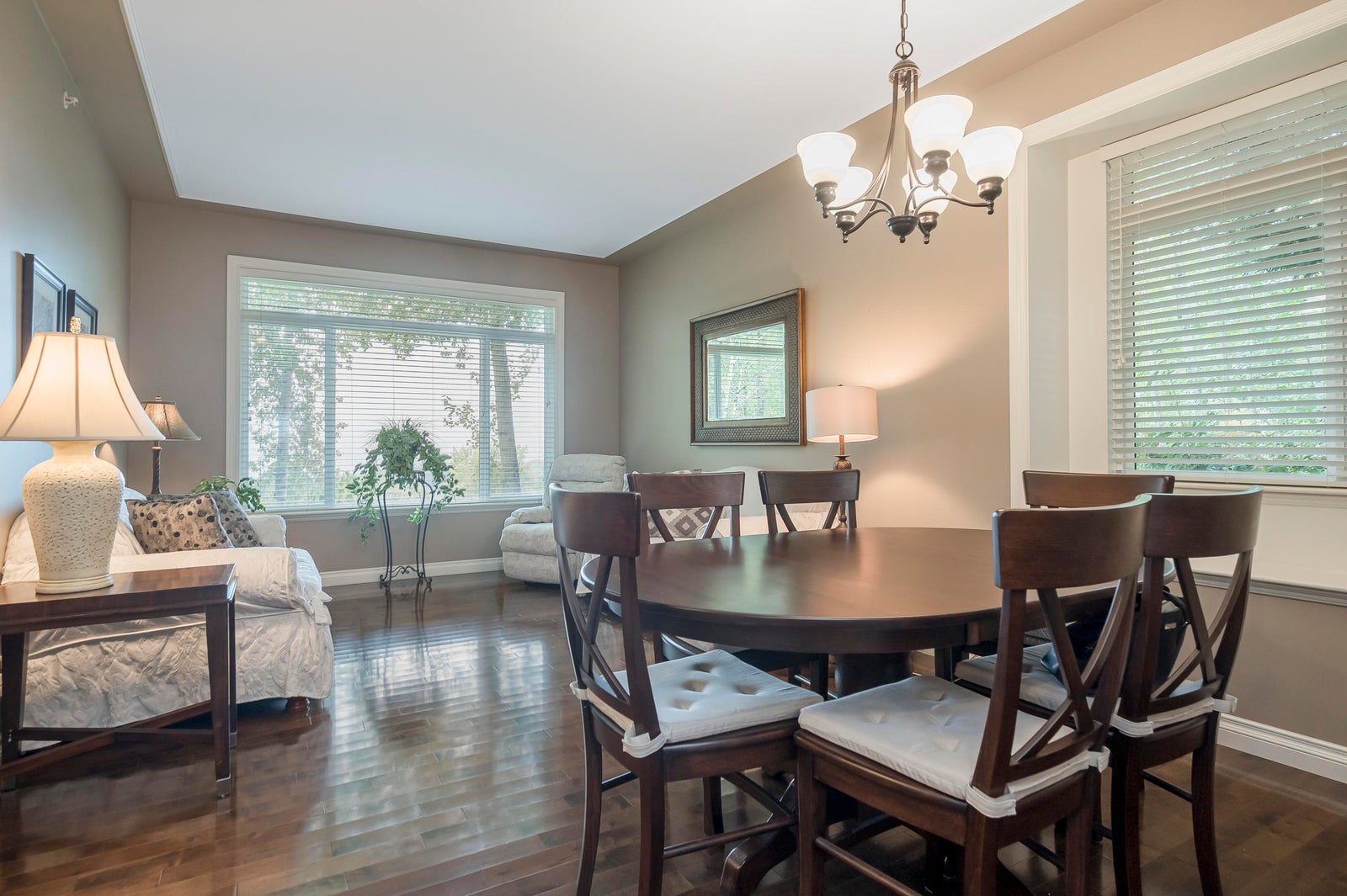 WOW! Talk about privacy! Peace and quiet with no traffic. Possibly the best location in King’s Gate! Super clean 3 level end unit townhome boasting Valley & Mountain views from all patios and decks (North shore mountains). Hardwood floors, 9ft ceilings, crown mouldings, family room & den on main floor. Master suite has large walk-in closet & easily accommodates king sized bed. Visitor parking just steps away. RV parking avail. No age rest + 2 pets ok. Walk to Ledgeview Golf Course.